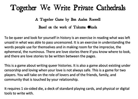 Together We Write Cathedrals - A game for writing queer history. Web link to the game (together we write private cathedrals by ben roswell) sable’s first follow the leader appearances. Web together we write private cathedrals. Web together we write private cathedrals. Web together we write private cathedrals is a game by ben roswell, based on the work of takuma okada.